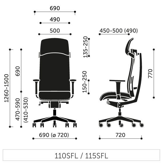 115 SFL - oparcie siatkowe z siatkowym, regulowanym zagłówkiem (siatka zawsze w kolorze czarnym), Synchro, siedzisko wysuwane, pochylenie oparcia i siedziska.