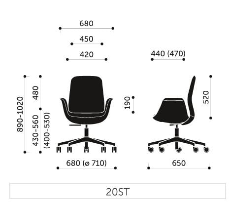 20 ST - fotel obrotowy, oparcie niskie, baza 5-ramienna, plastikowa, czarna lub szara. Mechanizm ST z możliwością odchylania i blokadą w pozycji wyjściowej, z regulacją wysokości.